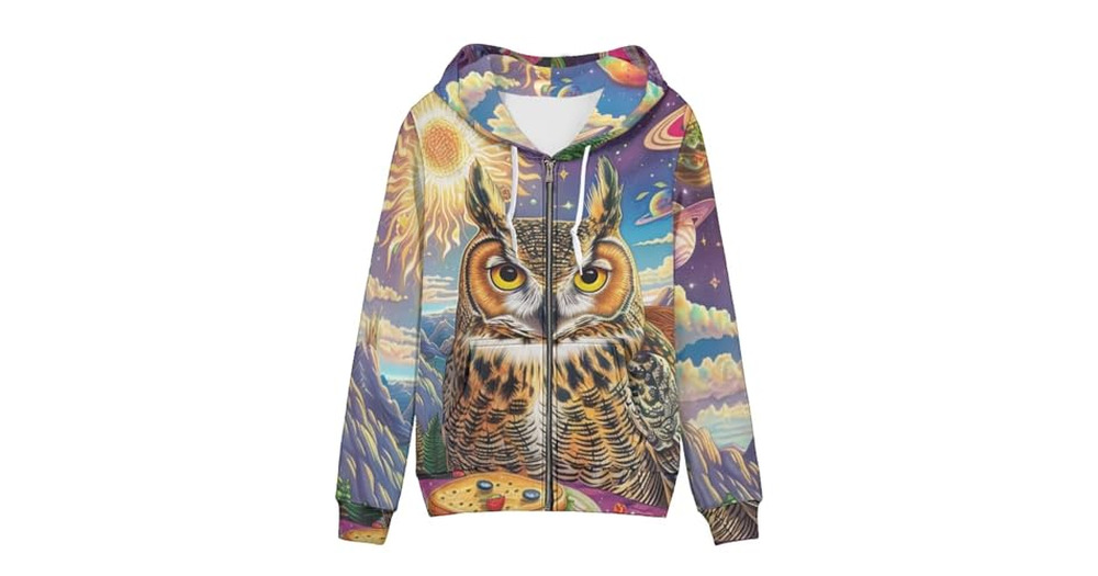 Allcute Graphic Print Zip Up Hoodie Women Comfy Spring Loose Fit Cheerful Owl Hoodies with Front Poc