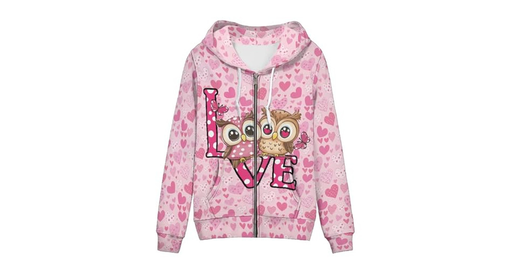 Showudesigns Cute Owl Zip Up Hoodie for Women Graphic Sweatshirts Valentines Full Zip Jackets Long S