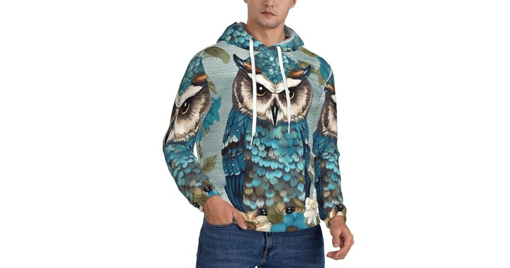 LZQPOEAS Owl Spring Flowers Turquoise Mens Fashion Hoodie Pullover Winter Fleece Hoodies Athletic Ho