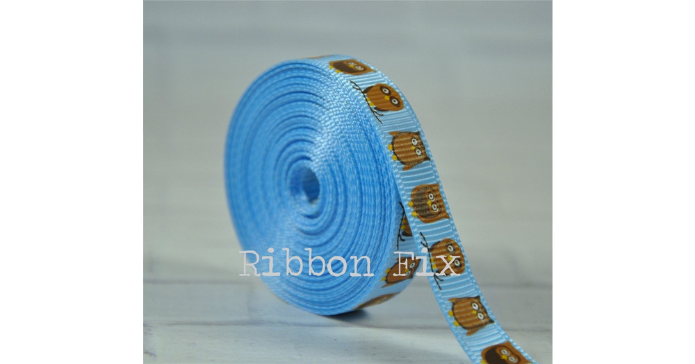 3/8" Baby Blue & Brown Owl Grosgrain Ribbon - US Designer Print - Hoot - Wedding Party - Ba