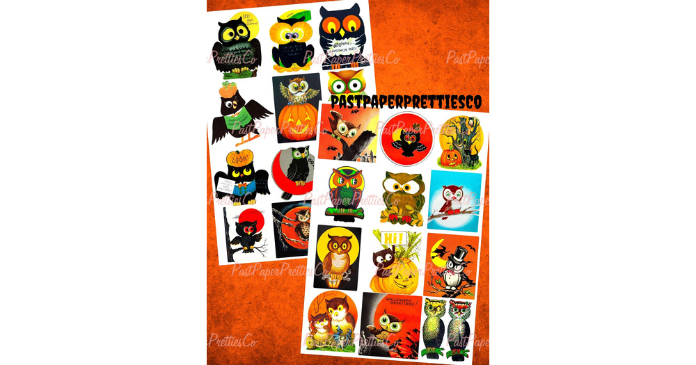 Vintage Retro Halloween OWLS Collage Sheets 24 Card Images Printable PDF Instant Digital Download Mi