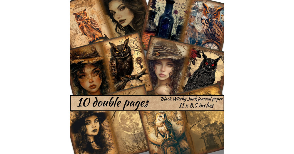 Black Witchy Junk journal paper, Black Owl Junk Journal Pages, Dark Witch Fantasy, Magical Witchy Ju