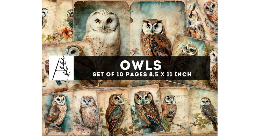 Owl Junk Journal Kit, Vintage Owls Paper, Digital Journaling Pages, Birds Shabby Pages, Watercolor O