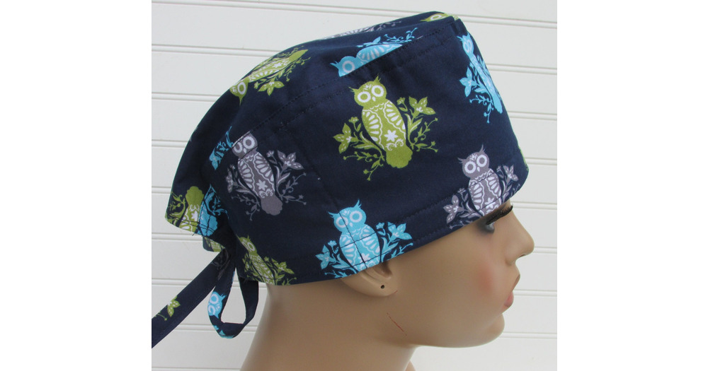 Handmade owl scrub cap chemo hair loss hat with sweatband.
