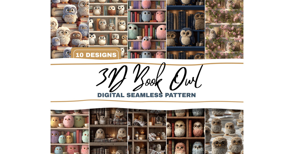 Cozy 3D Owl and Books Seamless Pattern Bundle | Cute Fluffy Owls on Bookshelves with Glasses | Whims