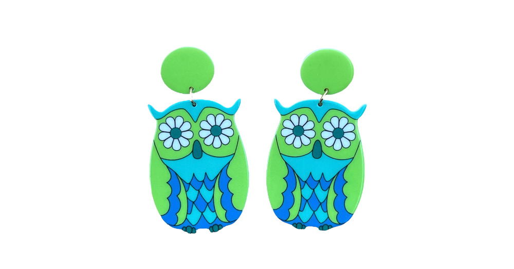 70s Hippie Flower Owl Earrings Retro Vintage Boho Colorful Animal Kitsch Funky 60s Style