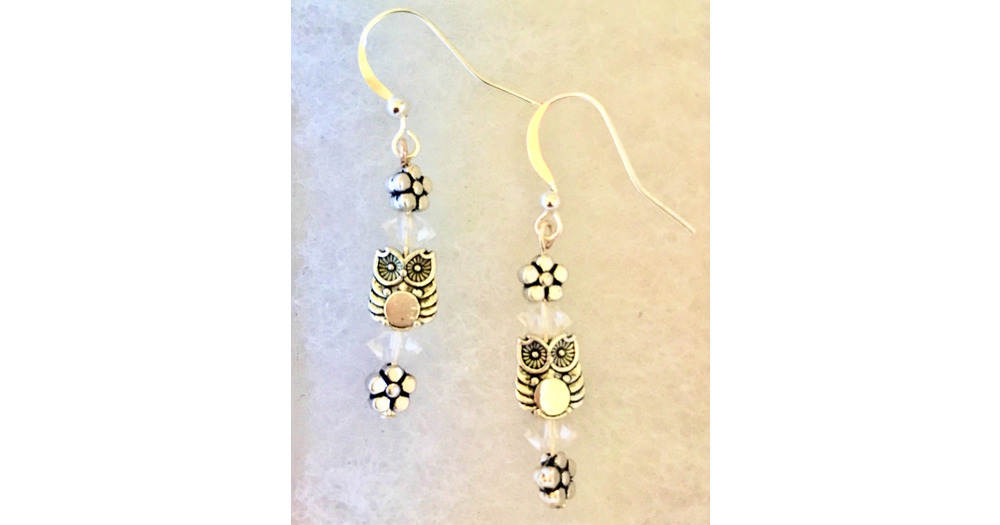 Silver Owl and flower Earrings, Silver Earrings, Owl jewlery, Silver Flower Beads