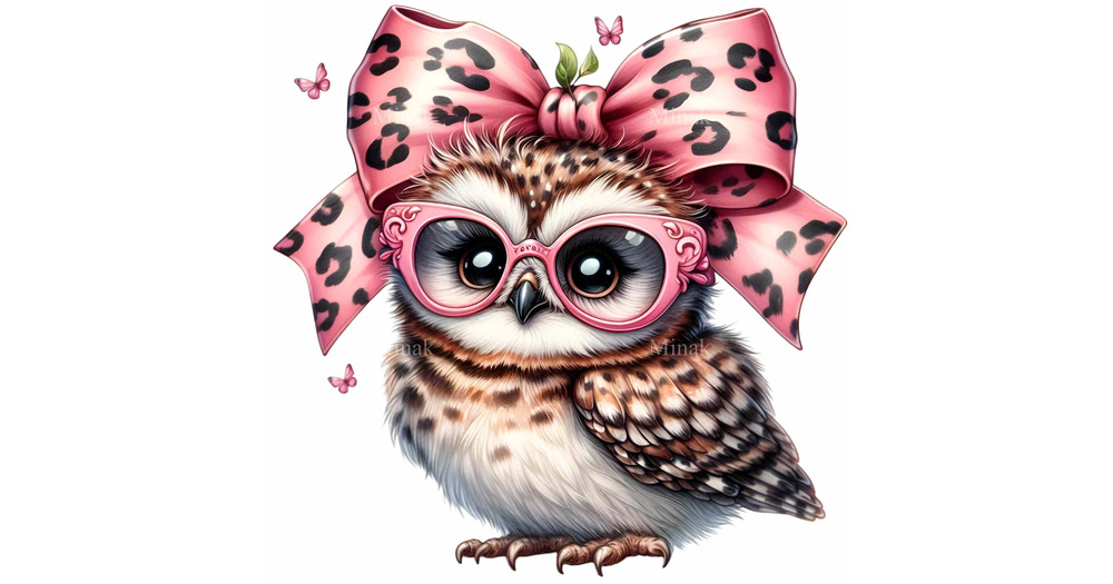 12 PNG Cute Owl with Pink Glasses and Leopard Bow PNG Clipart, Stylish Baby Owl with Big Eyes, Fun A