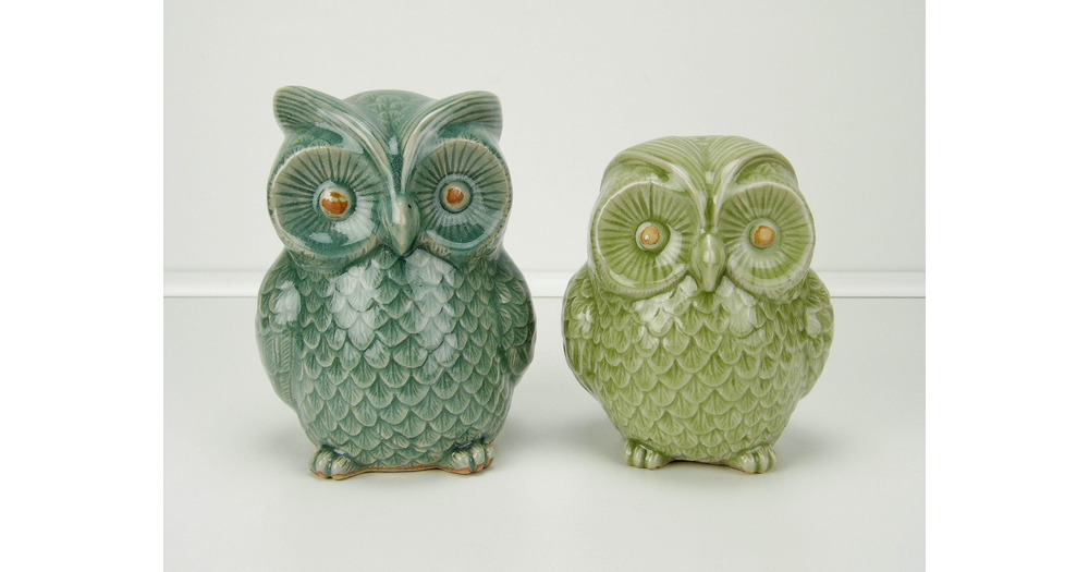 Rare - Set of Glazed Celadon Ceramic Owl Figurines / Décor from the 1980s