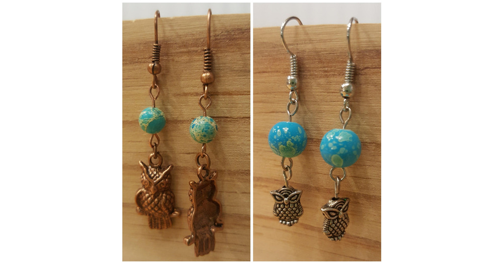 Owl Pendant Earrings - Bronze and Silver - Blue Turquoise with White Crackle Glass Beads