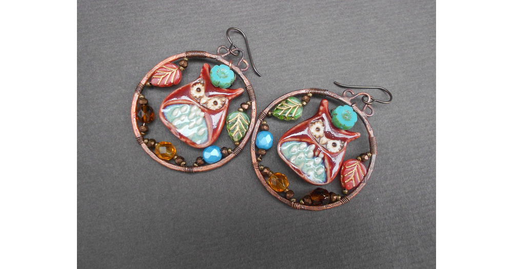 Ceramic Owl Earrings: Wire Wrapped Copper Hoop, Czech Glass Leaf