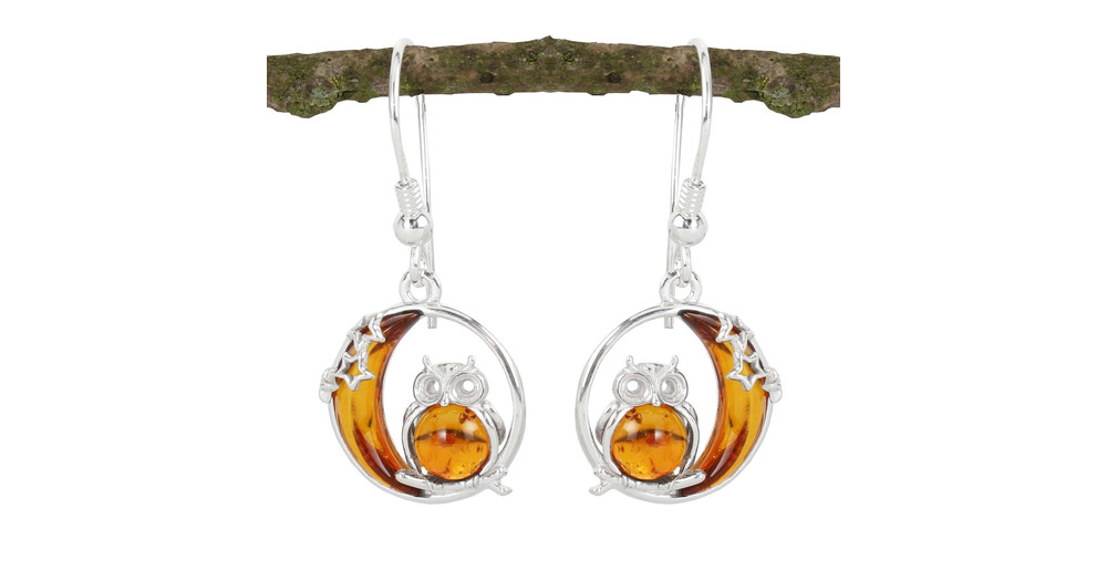 Sterling Silver HONEY Baltic Amber OWL in the MOON Drop Earrings, Beautiful Amber Earrings, Pretty O