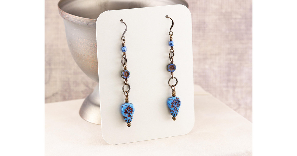 Long Blue Owl & Flower Beaded Dangle Earrings on Antiqued Brass Hooks, made with Czech glass bea