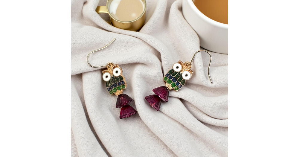 owl earrings with purple flower beads, hypoallergenic, lightweight, about 2.5 inches long
