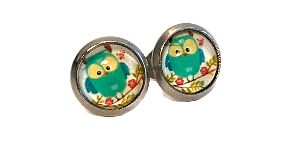 Sterling Silver Owl Earrings, Small Green Owl Studs, Hypoallergenic, Unique Gift for Girls, Cute Pos