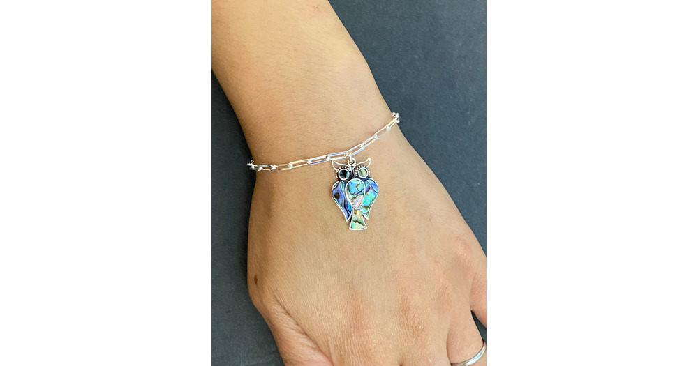 Abalone Shell Owl Bracelet, Sterling Silver Paperclip Bracelet, Dainty Abalone Shell Owl Charm Brace