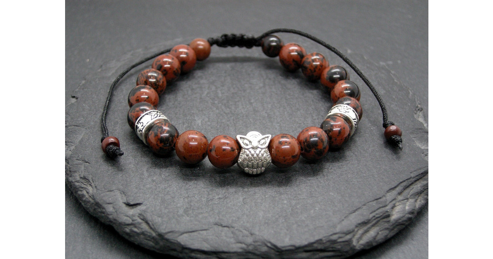 Mahogany Obsidian owl bracelet, stacking wristband, anxiety stone, adjustable unisex jewelry