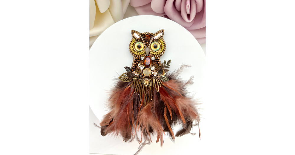 Handmade Beaded Owl Brooch: Feathered Rhinestone Bird Pin