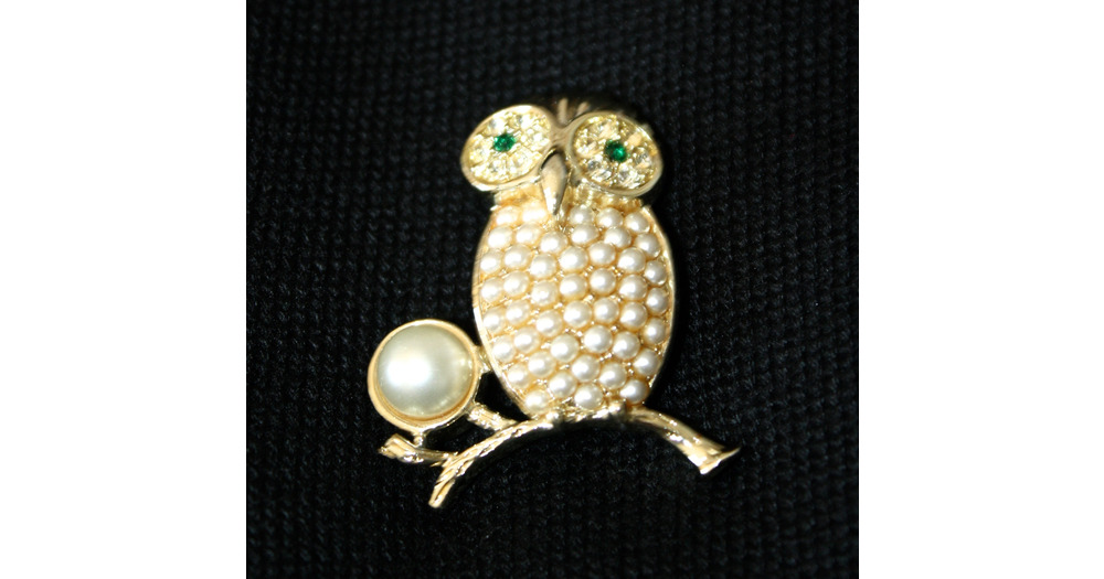 SARAH COVENTRY 1980s Gold OWL Brooch . Vintage 80s Gold & White Pearl Beads Designer Brooch Pin