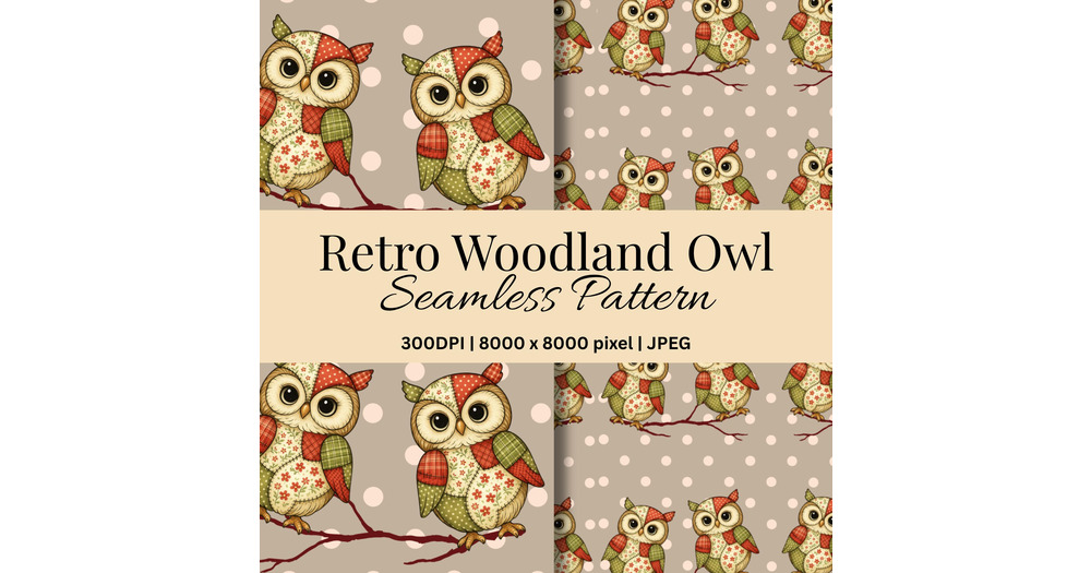 Patchwork Owl Seamless Pattern: Retro Polka Dot Woodland Background, Vintage Nursery Quilt & Wra