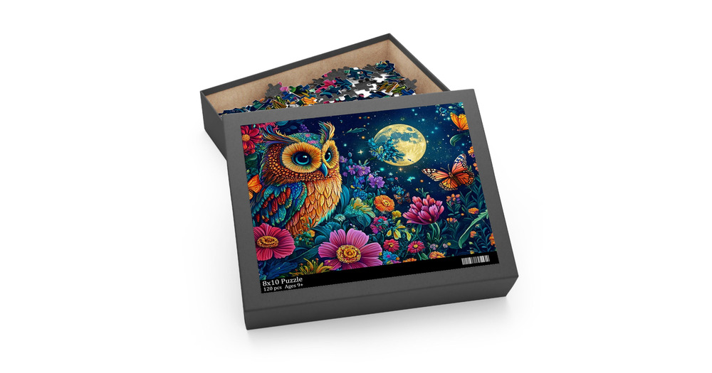 Owl Puzzle with Flowers & Butterflies - Moonlit Night Sky Jigsaw