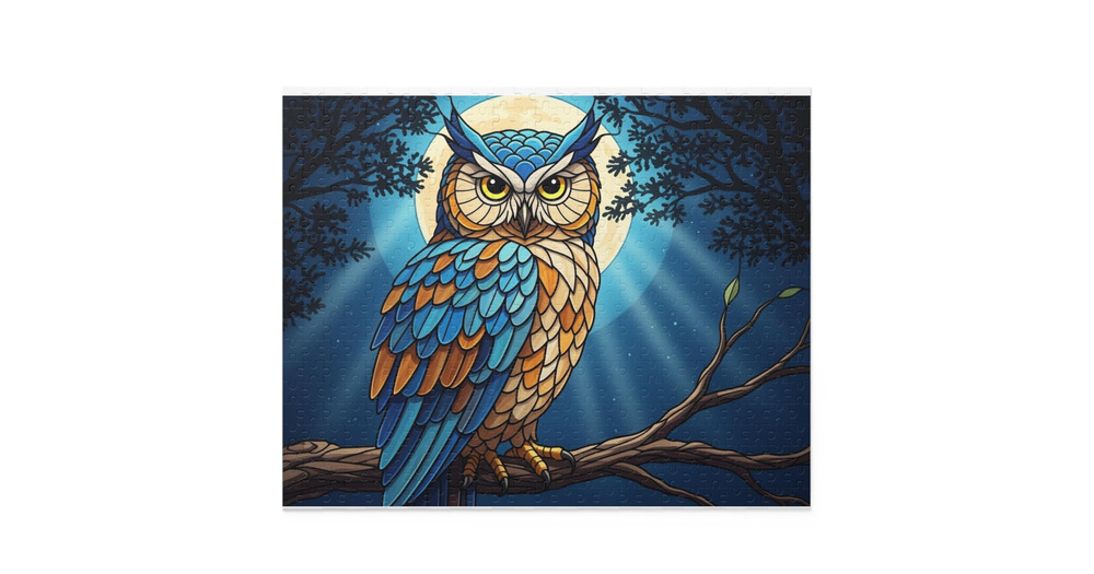 Jigsaw Puzzle, Mystical Stained Glass Owl with Moonlight, 120/252/500-Piece, Detailed Feathers, Blue