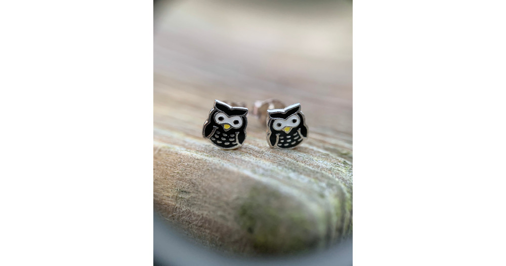 Cute Fun Black Wise Old Owl Sterling Silver Stud Earrings