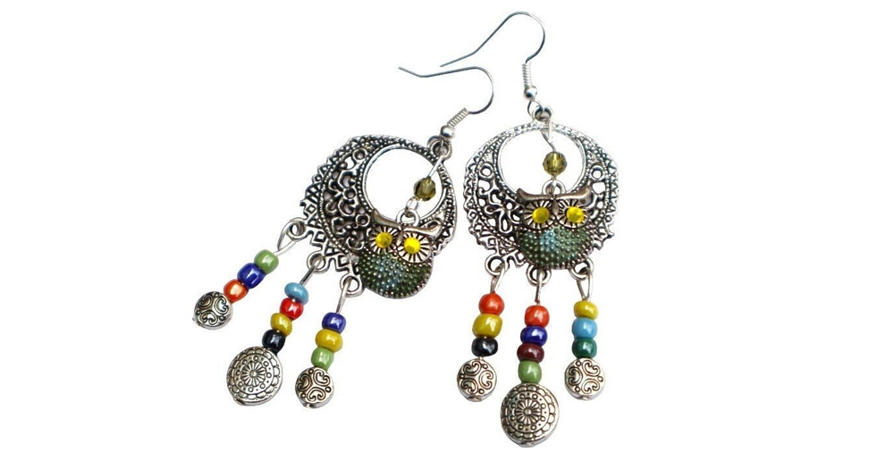 Whimsical Dangling Silver Owl Dangle Beads Earrings with Hand Painted Accents Crystal Rhinestones Cu