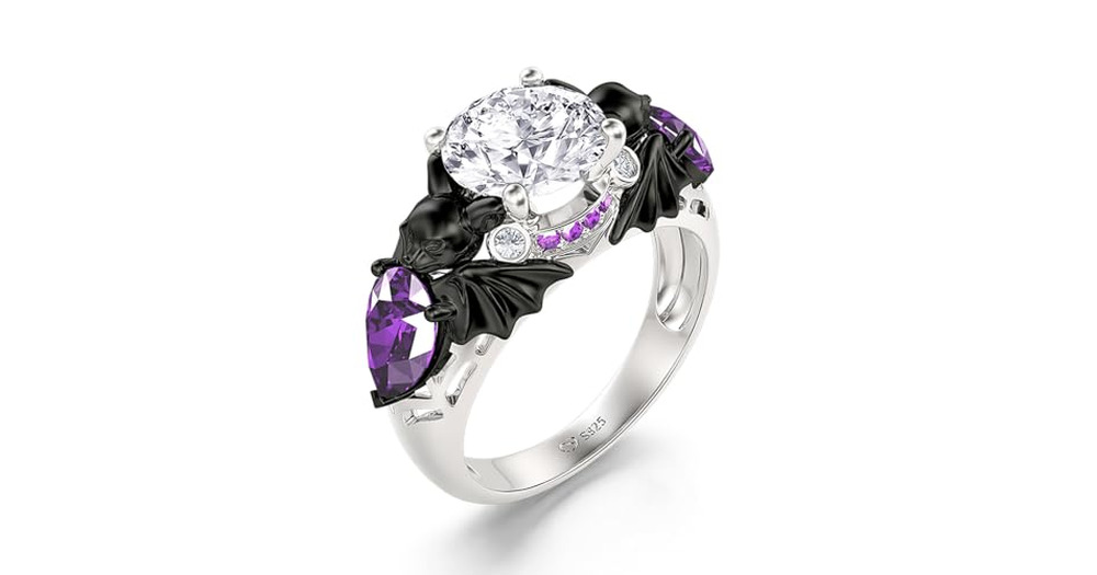 Jeulia Gothic Skull Diamond Rings:Sterling Silver Art Deco Owl/Bat Ring Two Tone Black Skeleton Ring