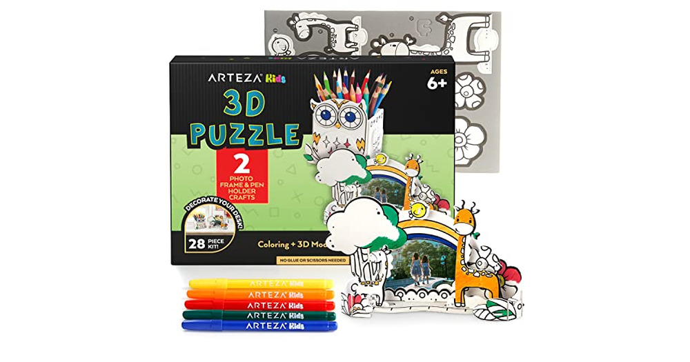 Arteza Kids 3D Puzzle, Owl & Giraffe to Craft, Photo Frame & Pen Holder Model Kit with 23 Fo