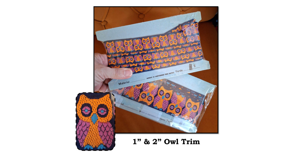 2 Packets - Vintage Embroidered Owls Trim, Navy Background with Orange Pink Owls 1" & 2&qu