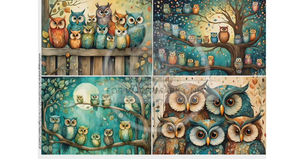 Decoupage Central, Crazy Owls, Blue, Colorful, Artistic, Owl Quad, DC597, Rice Paper, Decoupage, Mix