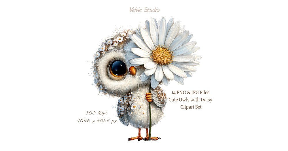 Whimsical Owl with Daisy Clipart Set: Pastel Floral Illustrations, 14 PNG & JPG (Digital Printab