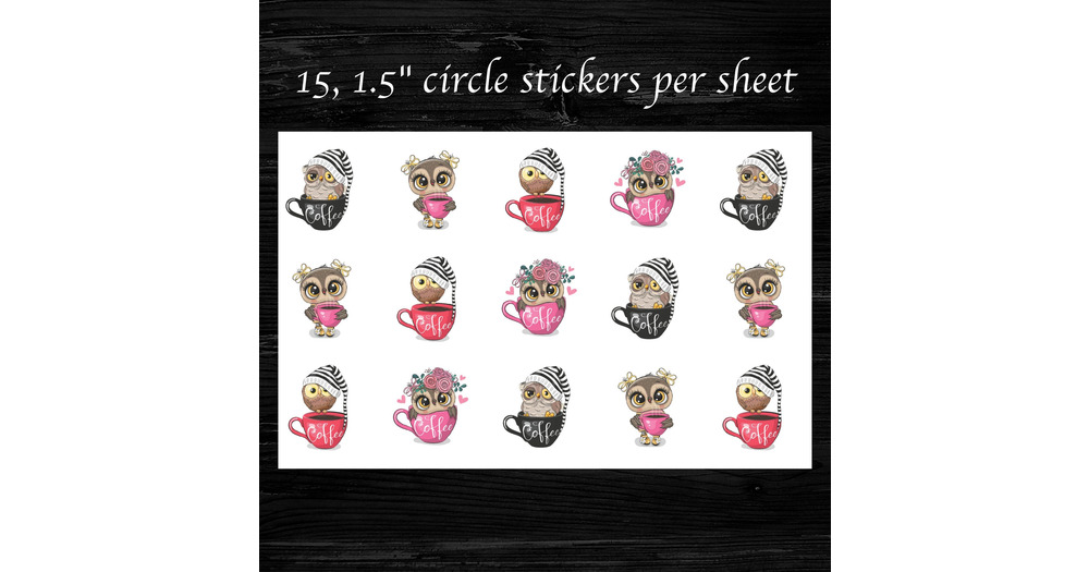 Coffee Owls Stickers | 15 Stickers per sheet | 1.5" Circles | Great for decorating your envelop