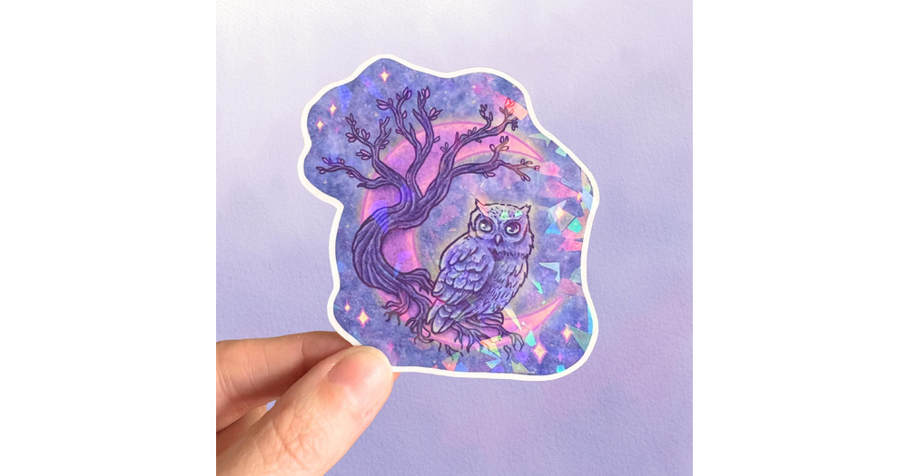Holographic Fantasy Owl Tree Vinyl Sticker | Celestial Nature Art