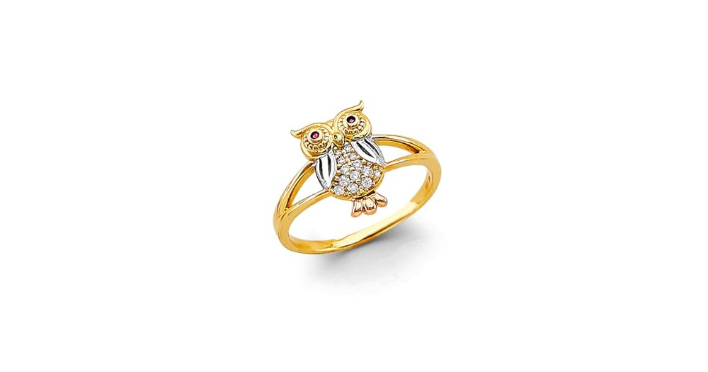 14k Tri Color Gold CZ Owl Ring - Size 7.5
