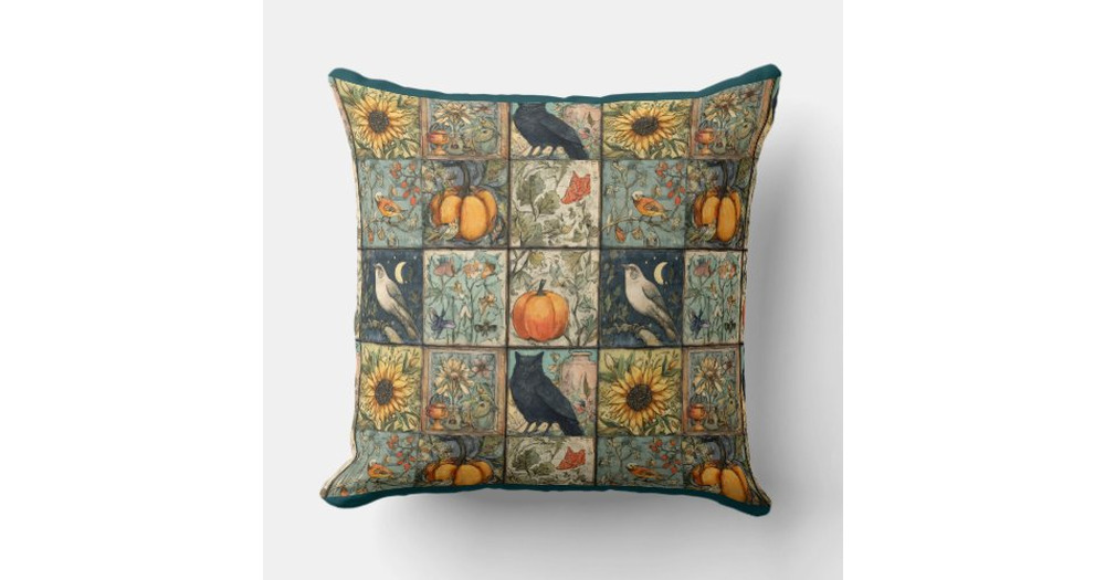 Vintage autumn patchwork look pumpkin owl flower throw pillow