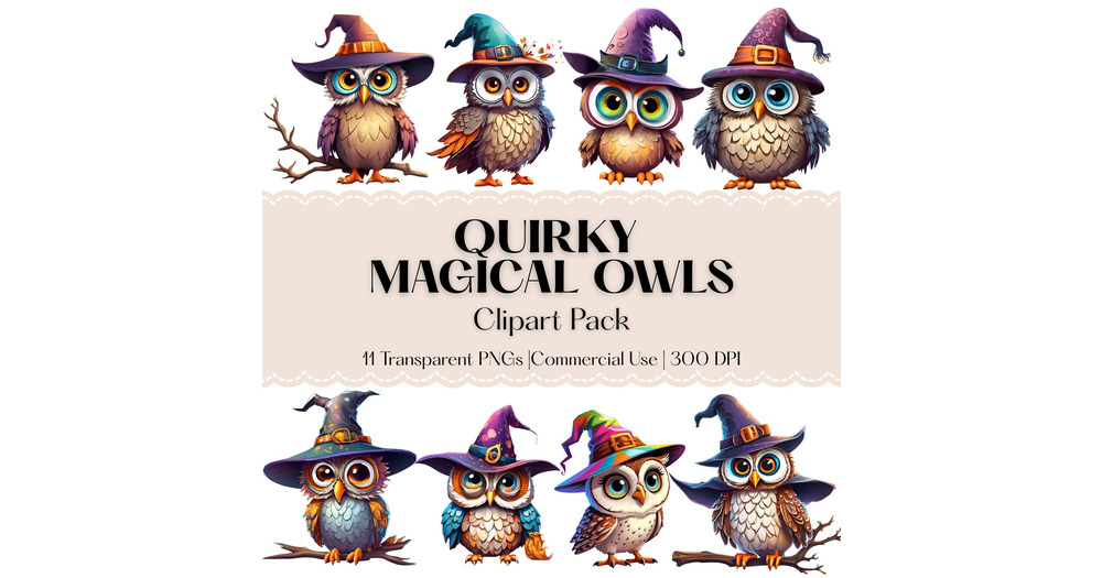 Quirky Magical Owls Clipart - Owls in Witch Hats - Halloween Birds - Watercolor Funky Owl PNGs - Fun