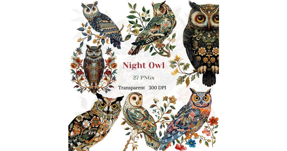Night Owl ClipArt, Whimsical Owl PNG, Vintage Bird Art, Wing Fantasy Graphic, Rustic Floral Owl Imag