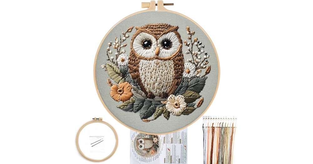 FONNUY Embroidery Kit for Beginners, Owl Flowers Pre-Stamped Pattern Kits for Adults with Hoop, Easy