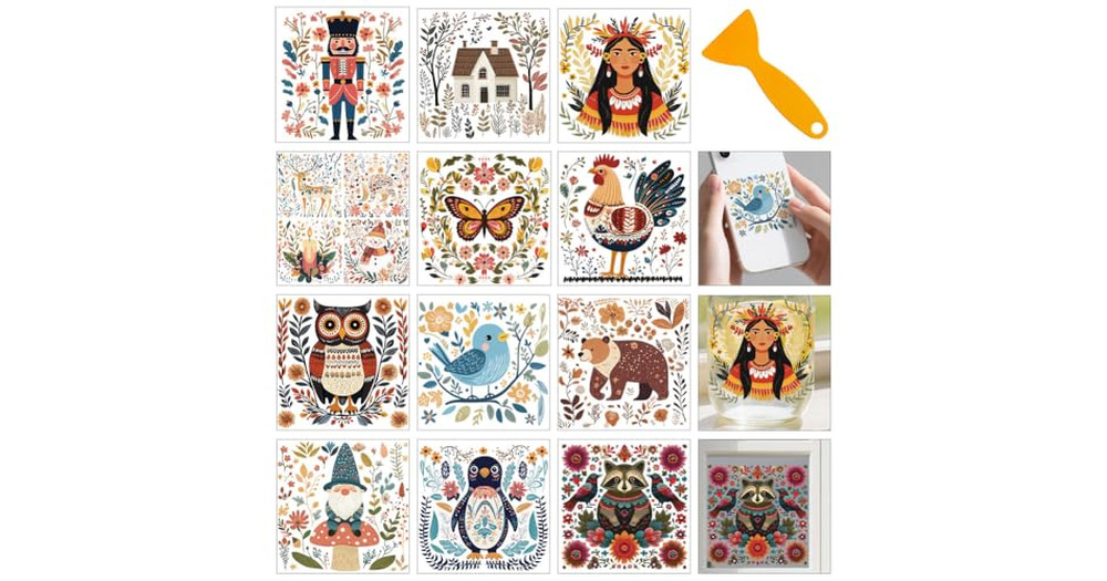 GOMAKERER 12 Sheets Boho Winter Flat Illustration Rub on Transfers, 12 Styles Owl Bear Penguin Snowm