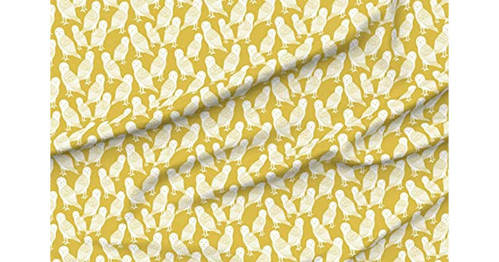 Spoonflower Fabric - Owl Bird Block Print Mustard White Hand-Carved Woodland Animals Bright Printed