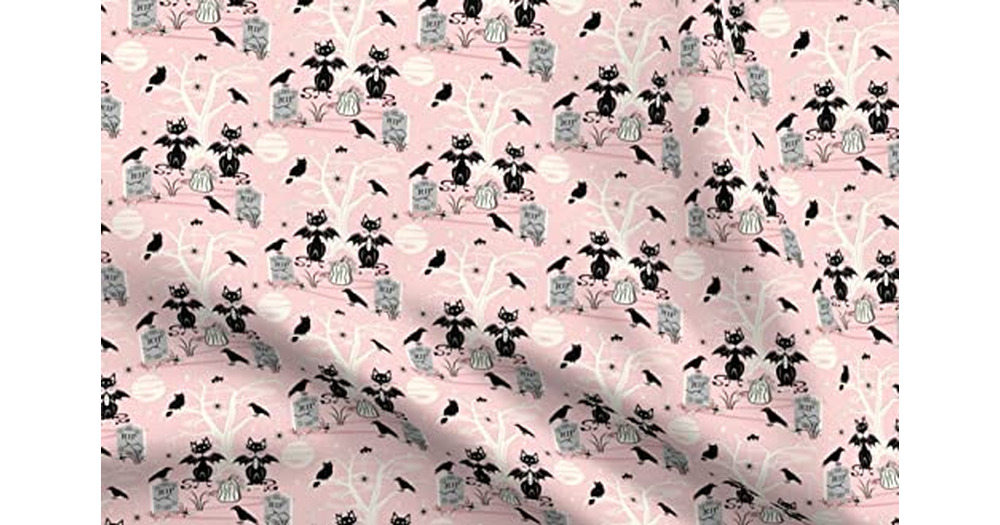 Spoonflower Fabric - Happy Cat Halloween Pink Retro Owls Bats Printed on Petal Signature Cotton Fabr