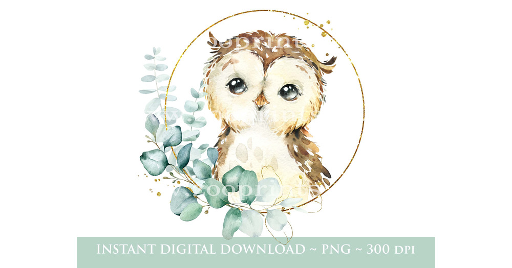 Baby Owl Green Wreath PNG, Woodland Birthday Party Clipart, Owl Sublimation, Baby Owl Birthday Card