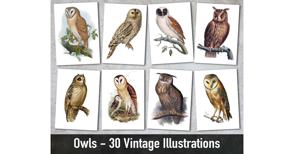 Owls, 30 Vintage Illustrations, Printable Animal Images, Digital Paper, Instant Download