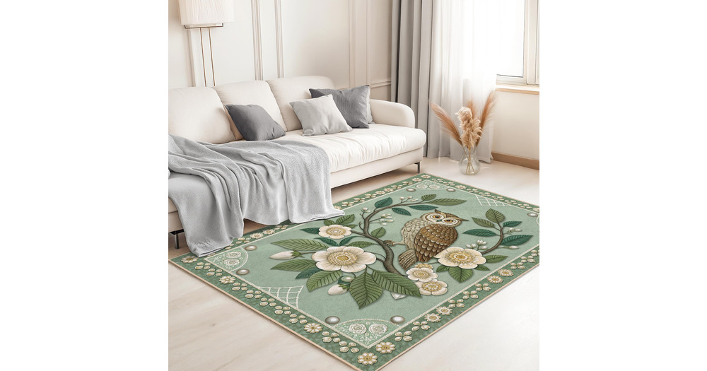Elegant Owl and Floral Branch Digital Printed Rectangular Rug | Boho Nature Inspired Washable Non-Sl