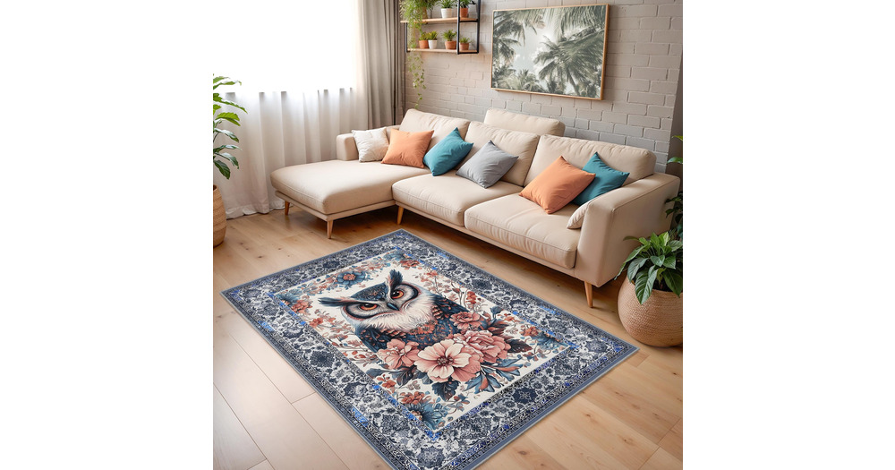 Elegant Owl and Floral Art Digital Printed Rectangular Rug | Bohemian Blue Border Carpet | Washable
