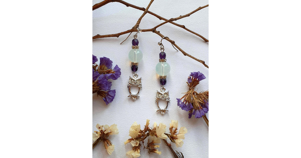Original Beaded earrings for her, Owl Pendant earrings, Moonstone earrings, Birthstone gift for girl
