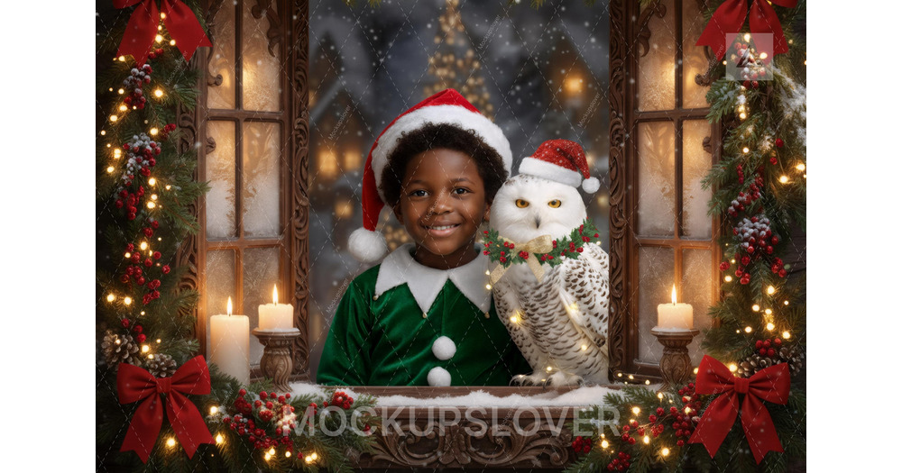 Christmas Window Digital Backdrop, Wise Owl, Winter Wonderland Photo Background, Holiday Kids Portra