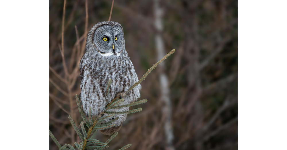 A great gray owl atop a pine tree in Sax Zim Bog | Giclee, Canvas, & Metal Prints